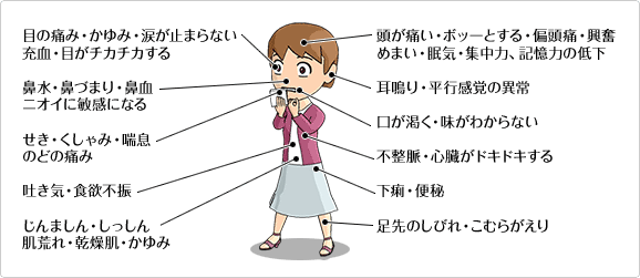 シックハウス症候群の症状は個人差が大きく、非常に多岐にわたります。また、不定愁訴と言われるような、本人にしか自覚できない症状が多く、自律神経失調症や更年期障害、風邪、精神疾患などと間違われてしまうこともよくあります。